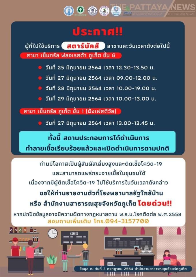 Het hoofd van het Phuket Public Health Office, de heer Koosak Kookiattikul, vertelde het Phuket Public Relations Office: “Op 19 juli werd een nieuw bevestigd geval van Covid-2 aangekondigd waarvan de tijdlijn betrekking had op een Starbucks in Central Floresta op de begane grond. ”
